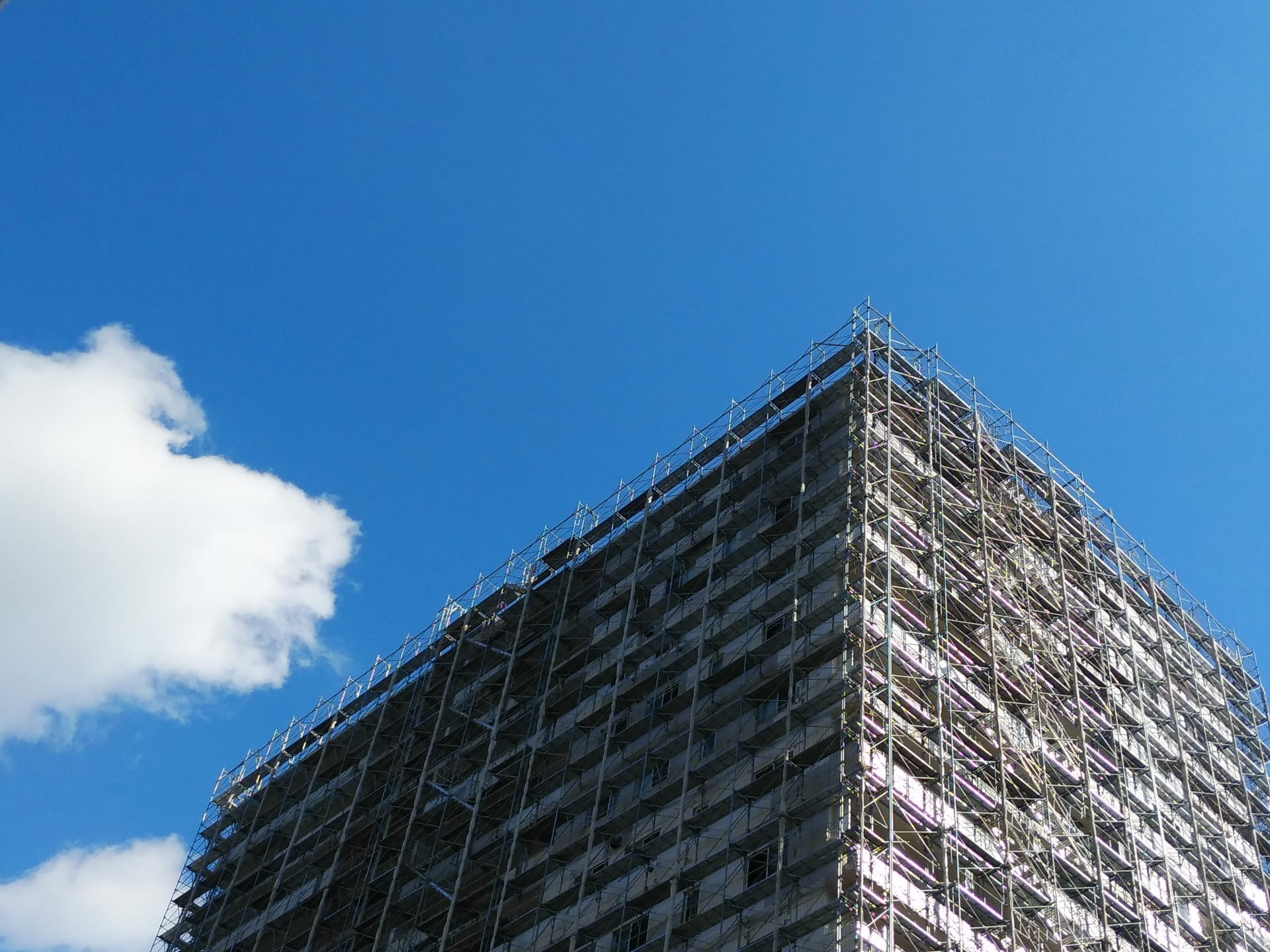 足場工事とは、建設現場で職人が高所作業を安全かつ効率的に行うために、鉄パイプや足場板を用いて一時的に作業通路や床(足場)を組み立て・解体する専門工事です。